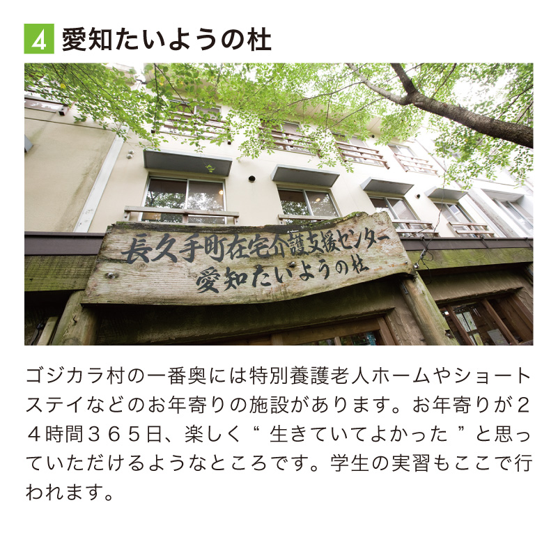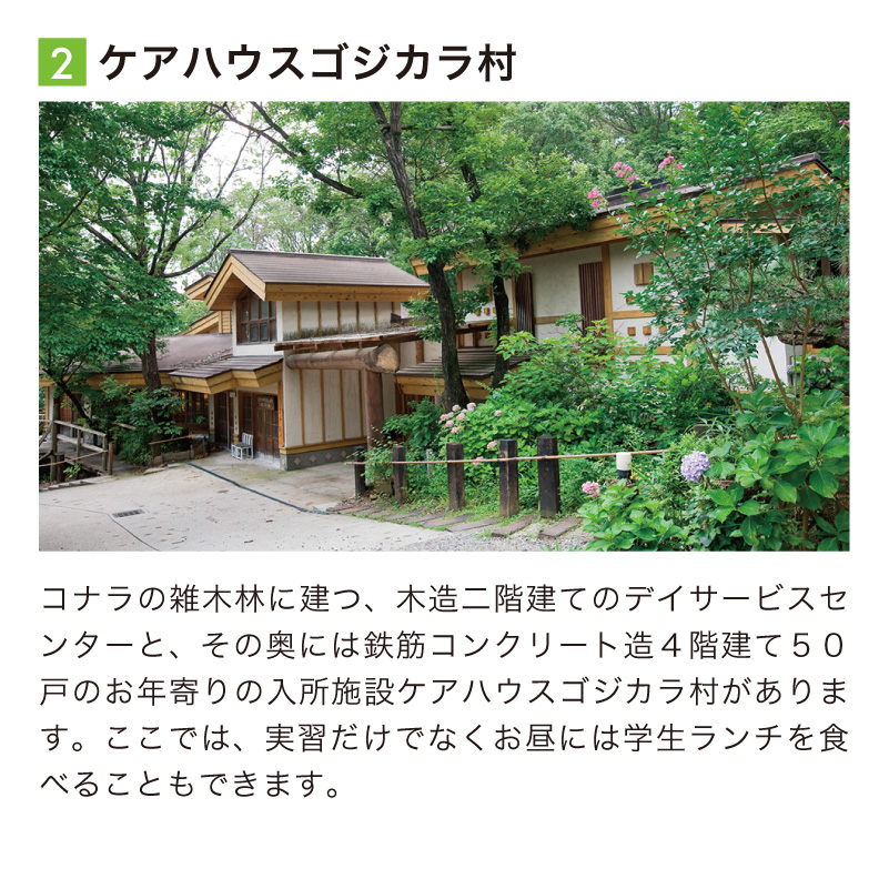 もりのがくえんがあるのは、多世代交流自然村「ゴジカラ村」。 そこには、ケアハウス、幼稚園、託児所などがあります。 子ども達やお年寄りとのふれあいを大切にしながら、本物の施設で、より実践的な力を身につけることができます。